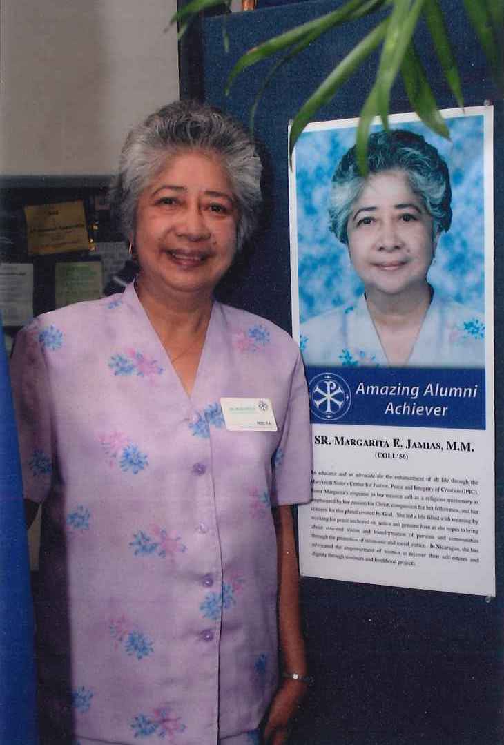 Sister Margarita was born in Masinloc, Zambales, Philippines on April 7, 1936 to Jose Jamias and Francisca (Edillor) Jamias. She has three sisters and one brother. In 1952, she graduated from Tabaco High School and then attended Maryknoll College, Quezon City, graduating with a Bachelor of Science in Education.