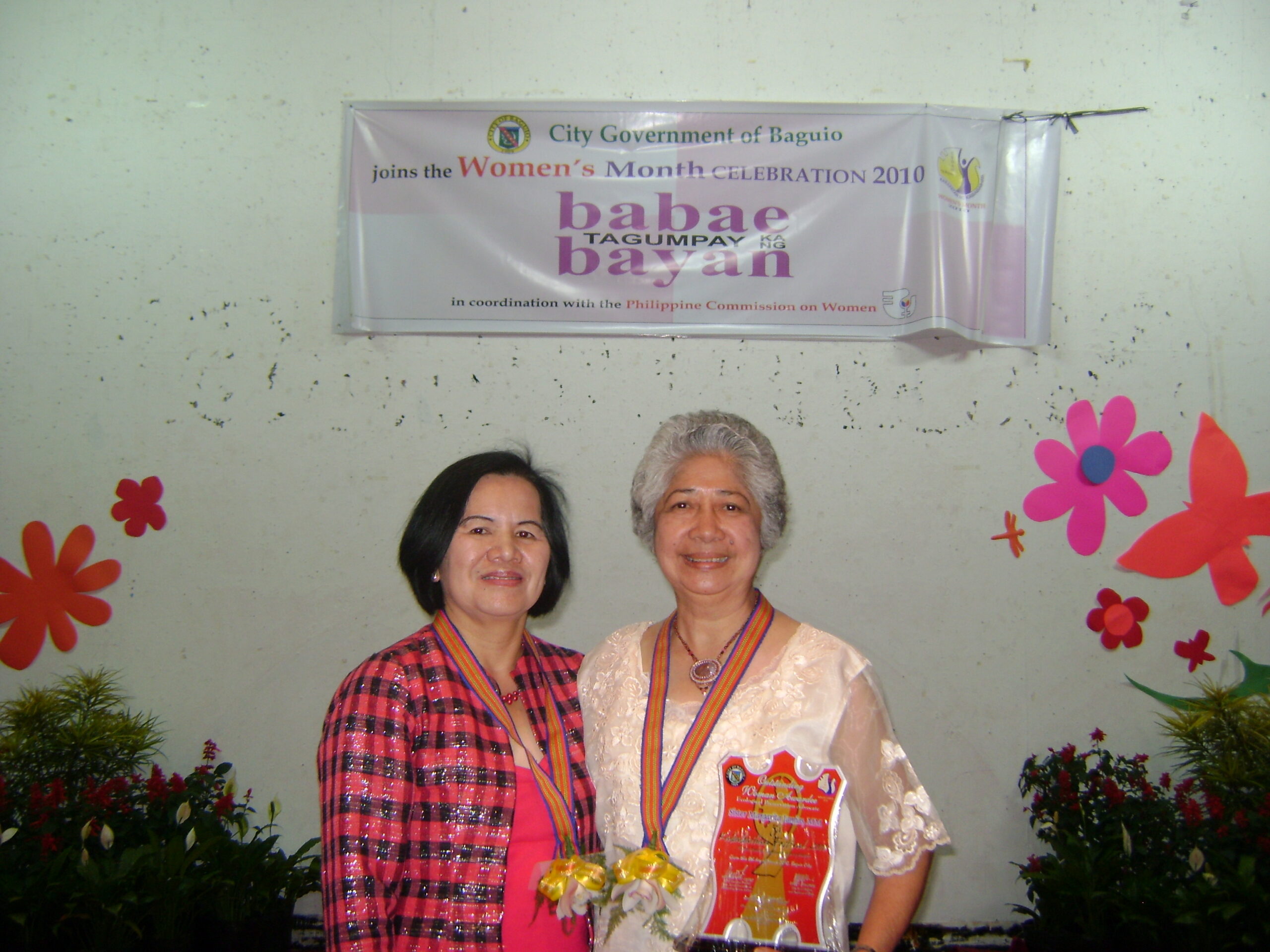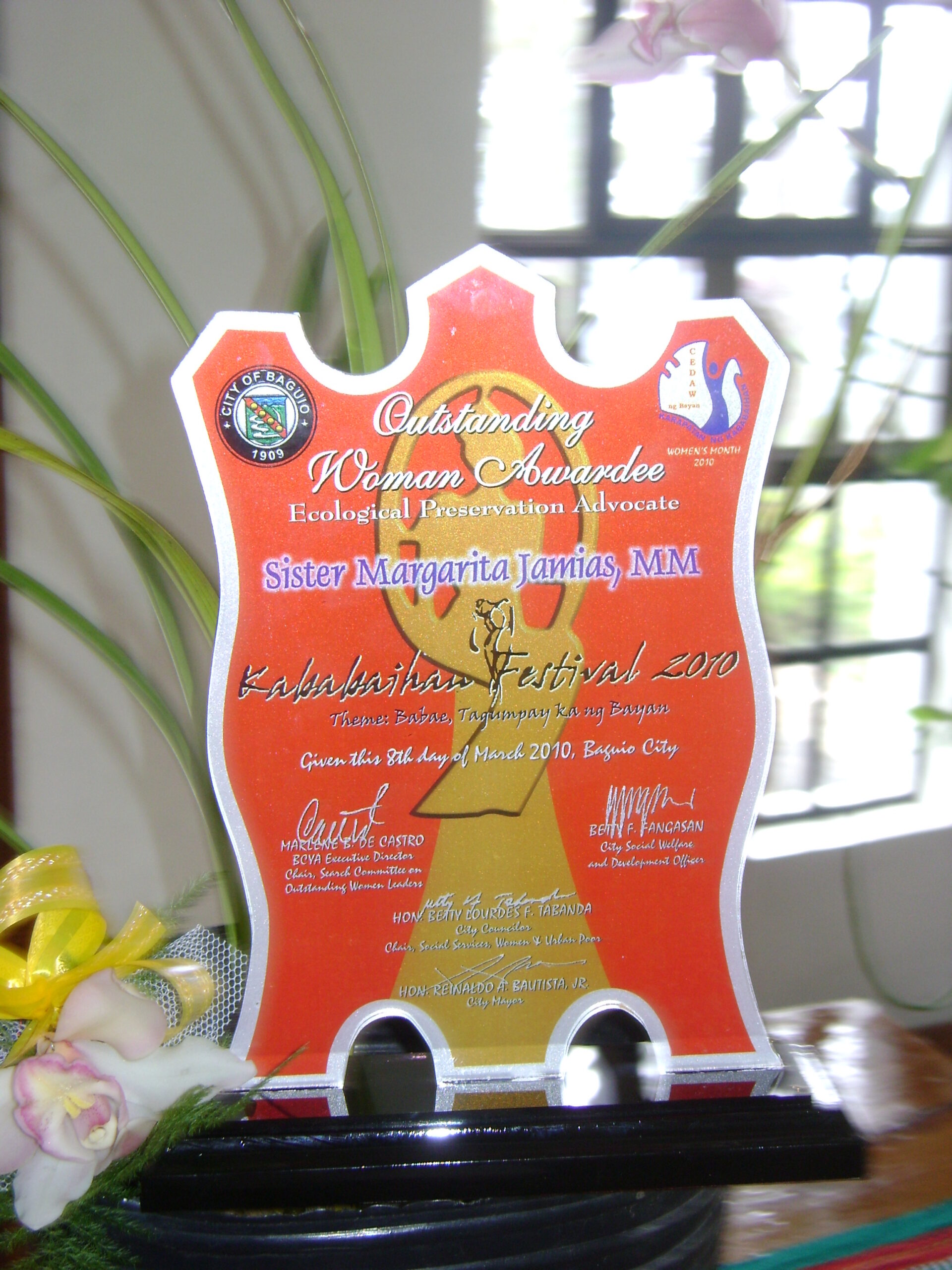 - The Outstanding Woman Award for Leadership in “Ecological Preservation”, given by the City of Baguio on March 8, 2010 at the Baguio Convention Center, Baguio City